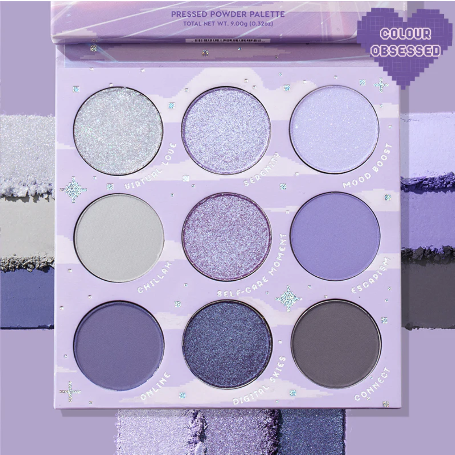 Gồm 9 gam màu tím nhung sống động và tím đậm trong các kết cấu Matte, Metallic, Matte Sparkle và Pearlescent Glitter. Sản phẩm có công thức bột phấn siêu đậm màu, lâu trôi, thoa đều và kết hợp mượt mà như một giấc mơ.