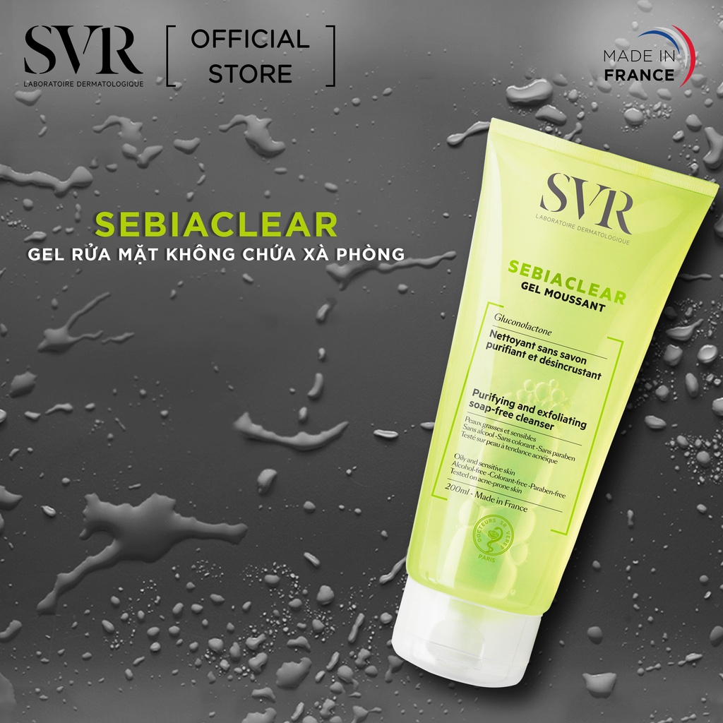 - Gel rửa mặt cho da dầu mụn SVR Sebiaclear Gel Moussant mang đến khả năng làm sạch sâu, tạo nên sự thúc đẩy cho quá trình tái tạo da và làm giảm tổn thương trên da, giúp ngừa mụn, cải thiện tình trạng mụn và ngừa thâm hiệu quả. Đồng thời hạn chế sự tiết dầu, làm lỗ chân lông thông thoáng hơn và ngừa mụn quay lại.
